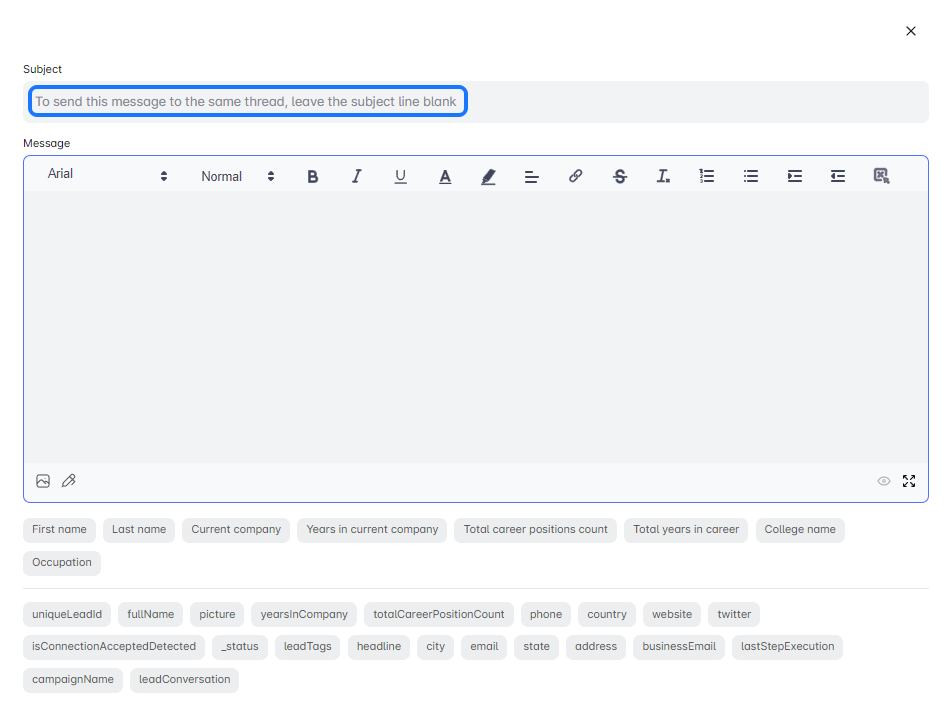 Great news! Now, you can keep emails organized in your campaigns by sending them in a continuous thread. Just leave the subject line blank in follow-up emails to connect them as one conversation. Streamline your communication with easeβtry it today to enhance your outreach! ππ